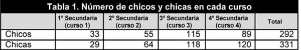 Los participantes fueron 623 estudiantes de secundaria (331 mujeres) con edades comprendidas entre los 12 y 16 años (1º a 4º curso de Educación Secundaria Obligatoria, que son los primeros cuatro años de la escuela secundaria obligatoria española), de diferentes escuelas españolas en la región de Cataluña. Todos los participantes tenían un perfil personal de Facebook con su verdadera identidad (véase tabla 1).
