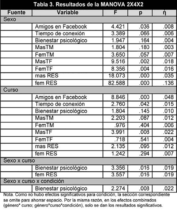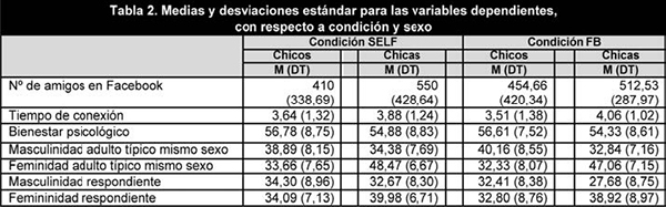 Se calcularon las subescalas de masculinidad (mas) y feminidad (fem) para la percepción del hombre típico y la mujer típica (obteniendo así masTM, femTM, masTF, femTF) de los correspondientes, así como para sí mismos, ya sea en la condición SELF o en la condición FB (obtención masRES, femRES). Se llevaron a cabo sendas pruebas t para muestras pareadas para los chicos y para las chicas para evaluar la diferencia entre la percepción de los participantes sobre sí mismos y un adulto típico (mujer típica en el caso de las niñas y hombre típico en el caso de los varones). Para probar los efectos del sexo, curso escolar y condición en el número de amigos de Facebook, la frecuencia de uso de Facebook, el bienestar psicológico, masTM, femTM, masTF, femTF, masRES, femRES, se realizó una MANOVA 2x4x2. Se calcularon las correlaciones entre las variables dependientes. Como indicador del tamaño del efecto, se calcularon los coeficientes eta-cuadrado (?). Todos los análisis de datos se efectuaron con el paquete estadístico SPSS, versión 22.