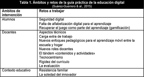 Dado que comprender el proceso de apropiación docente de la tecnología es fundamental para identificar retos y facilitar este proceso a otros docentes, este estudio condujo a la elaboración de la «Guía Práctica de la Educación Digital». Esta guía aportó trece recomendaciones didácticas estructuradas en tres grandes ámbitos de intervención (Tabla 1) para que los docentes en general y, los docentes del proyecto «Samsung Smart School» en particular, puedan mejorar su práctica educativa con las tabletas (Suárez-Guerrero, Lloret-Catalá, & Mengual-Andrés, 2015). En este artículo se detalla el proceso de investigación y los resultados que sostienen la guía práctica.