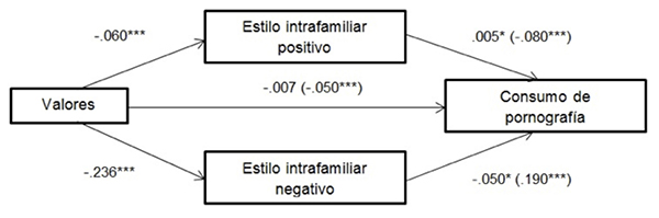 Para comprobar la segunda hipótesis se realizó un análisis de mediación múltiple con dos mediadores en paralelo. Los estilos de vida intrafamiliares positivo y negativo se sometieron a un análisis de mediación paralelo con el objetivo de explorar si estos estilos de vida mediaron la relación entre los valores de los adolescentes y su decisión de consumir pornografía. Se utilizó el procedimiento «bootstrapping» recomendado por Hayes y Preacher (2013) con el paquete macro Process del programa SPSS (Modelo 4, múltiples mediadores en paralelo). Primero, el efecto directo de los valores sobre el consumo de pornografía fue significativo, ß=-.05, t(8625)=–9.153, p<.001. Segundo, el efecto de los valores sobre los mediadores fue significativo, ß=–.06, t(8625)=–11.482, p<.001 para el estilo intrafamiliar positivo y ß=–.236, t(8625) =–47.131, p<.001 para el estilo intrafamiliar negativo. Tercero, cuando se introdujeron los mediadores y los valores como predictores, el efecto de los mediadores fue significativo, ß=-.08, t(8625)=-7.897, p<.001 para el estilo intrafamiliar positivo y ß=.190, t(8625)=17.197, p<.001 para el estilo intrafamiliar negativo, pero el efecto de los valores dejó de ser significativo, ß=-.007, t(8625)=–1.263, p=.21. Como se ilustra en la Figura 1, tanto el efecto indirecto del estilo intrafamiliar positivo como del estilo intrafamiliar negativo fueron estadísticamente significativos, ß= .005, SE=.001 [IC 95%: (.0034, .0073)] para el estilo positivo y ß=–.045, SE=.004 [IC 95%: (–.0518, –.0385)] para el estilo negativo. Preacher y Hayes (2008) demostraron que cuando el valor cero está fuera del intervalo, la mediación está presente. Debido a que el valor cero está fuera de ambos intervalos, se puede decir que el efecto directo de los valores sobre el consumo de pornografía estuvo mediado tanto por los estilos intrafamiliares positivos como por los negativos.