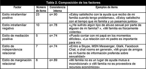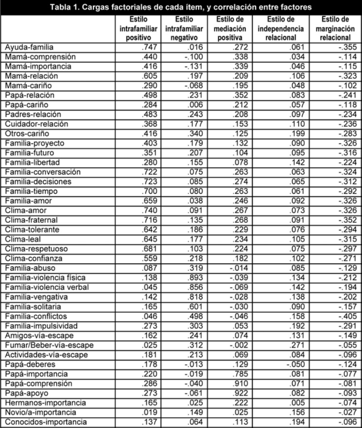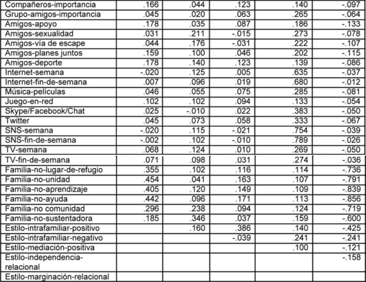 La composición del primer factor manifiesta una comunicación intrafamiliar positiva, el segundo la situación contraria (familia violenta), el tercero un clima de diálogo positivo entre los adolescentes y sus padres, el cuarto un contexto de socialización externo a la familia de gran relevancia para las decisiones, y el quinto la imposibilidad de contar con el apoyo afectivo y material de la propia familia. La media de cada uno de los factores (comunicación intrafamiliar, violencia intrafamiliar, apoyo paterno, uso de medios, exclusión familiar) se retuvo para emplearlas como variables predictores en un análisis de regresión por bloques.