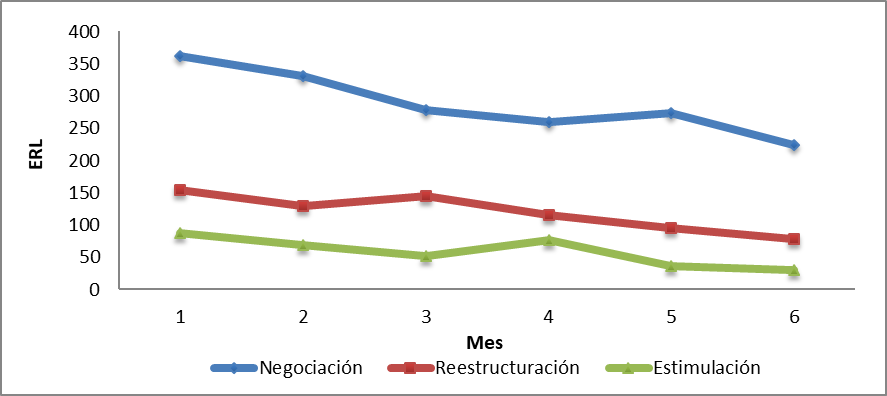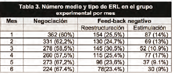 Las negociaciones fueron los ERL más abundantes, con porcentajes oscilando desde el 58% al 67% del total ERL por mes, lo que enfatiza el uso de la aplicación como un entorno rico para las negociaciones. En cuanto al feed-back negativo, las reestructuraciones fueron más frecuentes que las estimulaciones con porcentajes desde el 23% al 30%, lo que indica que los estudiantes colaboraron construyendo aprendizaje y ayudando a sus compañeros en la producción oral.
