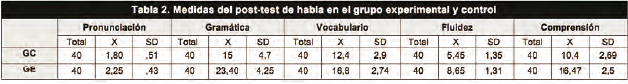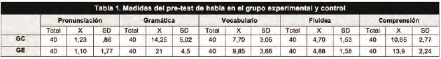 El test ANOVA de medidas repetidas para muestras relacionadas se empleó para confirmar que la diferencias entre ambos grupos eran estadísticamente significativas, y el ajuste de Bonferroni se usó para contrarrestar las comparaciones múltiples. Los resultados del pre-test de habla no cosecharon grandes diferencias entre el grupo experimental y control en cuanto a vocabulario (X=2.1; p<.05), la media de los puntos para pronunciación (X=.12; p>.05), gramática (X =0.7; p>.05), fluidez (X=.17; p>.05) y comprensión (X=.25; p>.05) no mostró ninguna diferencia significativa como se presenta en la tabla 1.