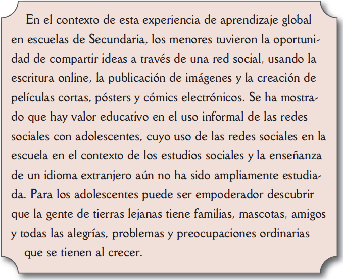 La oportunidad de hablar saltándose las limitaciones espacio-temporales puede ser transformadora. Este artículo ha ofrecido el estudio del caso práctico de una colaboración entre profesores en estados unidos (EE.UU.) y Turquía, donde alumnos de séptimo grado interactuaron entre sí informalmente a través de una red social como medio para activar la voz de los alumnos y promover la comprensión cultural. En el contexto de esta experiencia de aprendizaje global en escuelas de secundaria, los menores tuvieron la oportunidad de compartir ideas a través de una red social, usando la escritura online, la publicación de imágenes y la creación de películas cortas, pósters y cómics electrónicos. Se ha mostrado que hay valor educativo en el uso informal de las redes sociales con adolescentes, cuyo uso de las redes sociales en la escuela en el contexto de los estudios sociales y la enseñanza de un idioma extranjero aún no ha sido ampliamente estudiada. Para los adolescentes puede ser empoderador descubrir que la gente de tierras lejanas tiene familias, mascotas, amigos y todas las alegrías, problemas y preocupaciones ordinarias que se tienen al crecer. La oportunidad de usar las redes sociales para mantener una conversación –hallando puntos en común– puede tener beneficios que incluyen pero van más allá del dominio y uso de la gramática inglesa.