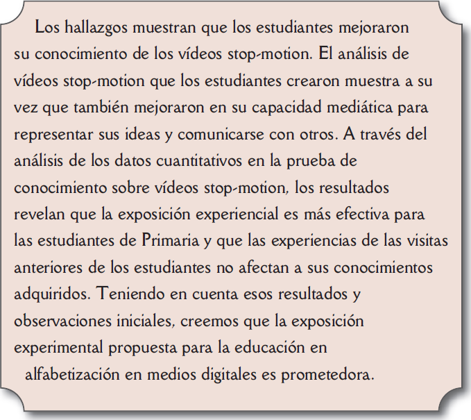Los hallazgos muestran que los estudiantes mejoraron su conocimiento de los vídeos stop-motion. El análisis de vídeos stop-motion que los estudiantes crearon muestra a su vez que también mejoraron en su capacidad mediática para representar sus ideas y comunicarse con otros. a través del análisis de los datos cuantitativos en la prueba de conocimiento sobre vídeos stop-motion, los resultados revelan que la exposición experiencial es más efectiva para las estudiantes de primaria y que las experiencias de las visitas anteriores de los estudiantes no afectan a sus conocimientos adquiridos. Teniendo en cuenta esos resultados y observaciones iniciales, creemos que la exposición experimental propuesta para la educación en alfabetización en medios digitales es prometedora.