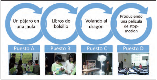 La exposición experimental expuesta se separó en cuatro puestos y se diseñó para enseñar a los estudiantes el concepto de la persistencia visual y la producción de una película stop-motion (Figura 1). Como se muestra en la Figura 1, se permitió a los estudiantes de 3º de primaria entrar en la sala de exposición para recibir el programa de estudios de 100 minutos cada vez. La sala de exposición se dividió principalmente en cuatro partes: puesto a, puesto b, puesto C y puesto d (Figura 1).