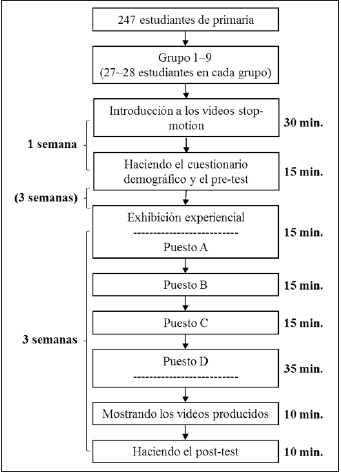 La Figura 2 muestra el procedimiento experimental. Todo el procedimiento abarca tres clases de 50 minutos durante un período de siete semanas sucesivas. Al principio, 247 estudiantes se dividieron en nueve grupos. En la primera semana se seleccionaron y mostraron a los estudiantes los vídeos stop-motion que fueron creados por otros estudiantes de diferentes países (por ejemplo, «t-shirt War», «es un kinder Magic», «deadline post-it») durante una sesión de clase regular. Al final de la misma clase, el cuestionario demográfico y el pre-test de conocimiento sobre vídeos stop-motion se pasaron a los estudiantes en todos los grupos. Tres semanas más tarde, se dispuso que solo un grupo participara cada vez en la exposición experiencial durante dos sesiones de clase regulares. La participación de los estudiantes cubrió un período de tres semanas. La exposición experiencial estaba compuesta por cuatro puestos. En cada puesto, los profesores llevaron a los estudiantes a involucrarse en las actividades. Y luego, los profesores mostraron a los estudiantes los vídeos creados por ellos mismos e hicieron comentarios favorables sobre sus obras. Al terminar las actividades de aprendizaje del día, se les dio a los estudiantes 10 minutos para completar el post-test de conocimiento sobre los vídeos de stop-motion.