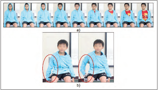 El formato, la continuidad y la secuenciación de los vídeos producidos promediaron las puntuaciones de 30, 17,3 y 23,0, respectivamente. Los vídeos de stop-motion seleccionados promediaron una puntuación global de 71,2 (de=10,56). Las puntuaciones globales de estos cortometrajes revelan que los estudiantes llegan a producir películas de buena calidad al participar en las exposiciones. Así se muestra en un ejemplo (Figura 3a), donde los estudiantes representan una película stop-motion sobre cómo quitarse de forma fácil un anorak. En particular, el desglose sugiere que todos los grupos pueden conseguir satisfactoriamente el formato de los vídeos.