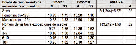 Se realizó un ANCOVA para determinar si existían diferencias significativas por género en relación a los conocimientos de los participantes en el pre-test y post-test de la prueba de animación stop-motion. Se encontraron efectos significativos a través de diferentes géneros para las puntuaciones de conocimientos posteriores a la prueba, F(1, 244)=5,32, p=0,04. Los análisis post hoc de los resultados muestran que las mujeres obtienen mejores resultados que los estudiantes varones.