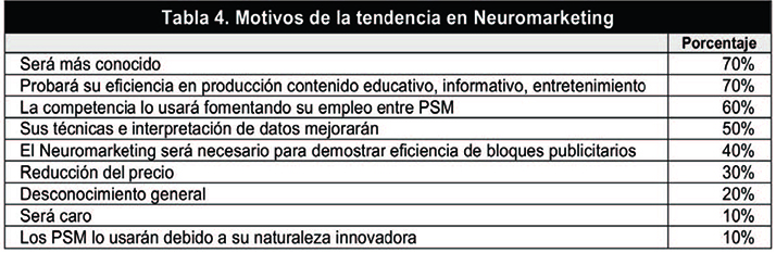 Para determinar el alcance de la metodología neurocientífica entre los SAP europeos, se ha contado con la participación de consultoras de Neuromarketing (n=11). Cada compañía ha estimado el grado de introducción de este tipo de investigación en sus respectivos países. Los resultados muestran que la investigación con técnicas neurocientíficas en televisiones públicas de países como Finlandia, Francia y Bélgica tienen nula o poca presencia frente a países como Dinamarca, Reino Unido, Italia y Alemania con niveles medios de empleo. La proyección de futuro de estos estudios es positiva para todos los países analizados. En un plazo de cinco años se espera que Bélgica y Francia sean los países con mayor desarrollo debido a su escasa implementación actual. Finlandia y Alemania aumentarán levemente su uso, mientras que Reino Unido y Dinamarca, ya con presencia elevada, quedarían en el mismo nivel. Italia, por su parte, descendería levemente su uso. De acuerdo a los consultores, esta tendencia positiva obedece a los motivos de la Tabla 4.