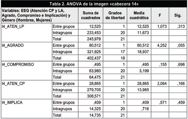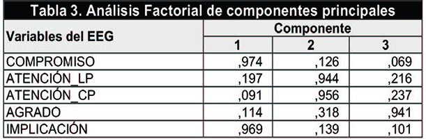 Los resultados del «Eye Tracking» respecto a la hipótesis 1 (Las mujeres mostrarán mayores puntuaciones en los índices de atención, agrado y recuerdo) no confirman la hipótesis. La Tabla 1 muestra unos resultados contrarios a los esperados: las mujeres presentan una conducta ocular caracterizada por un mayor número de fijaciones (2.056 frente a 1.720 de los hombres), lo cual implica una mayor frecuencia de fijaciones por segundo (2,34 frente a 1,96 de los hombres) y unas fijaciones más rápidas (368 mgs frente a 459). Es decir, la conducta visual de las mujeres muestra un patrón más rápido de movimientos. Se trata de una conducta más «sacádica» visualmente que la de los hombres. Los movimientos sacádicos son los saltos rápidos e intermitentes en la posición del ojo para fijar un objeto en la visión foveal. Es muy posible que estos resultados se deban a un patrón de conducta visual propio de las mujeres, con independencia del tipo de tarea al que se enfrentan. Aunque la conducta visual no ha sido apenas estudiada desde el punto de vista de las diferencias de género desde la óptica psicofisiológica, existen evidencias que apuntan hacia un comportamiento diferencial entre hombres y mujeres en este campo (Stemmler, 2005). Los resultados del EEG (Tabla 2) muestran que las mujeres arrojan mayores puntuaciones en la variable «agrado» respecto a los hombres, sin arrojar diferencias en el resto de las variables del EEG: atención (largo plazo y corto plazo), nivel de compromiso e implicación (p<.055). Sin embargo, este resultado se encontró únicamente en aquella imagen que demostró un recuerdo espontáneo en el cuestionario final (cuestionario de «saliencia» o impacto estimular) del 100% (valor medio de recuerdo espontáneo para total imágenes 37%) lo que permite suponer que se trataba de una imagen de especial impacto entre los sujetos, dado su alto valor respecto al valor medio de recuerdo y que fue la única con un 100% de recuerdo (imagen 14 de la cabecera de «conducta sexual», la imagen reflejaba un condón). Este resultado podría indicar que, frente a una imagen de elevado impacto (alta capacidad de impacto, en términos de Neuromarketing o publicitarios) el EEG arroja valores más elevados en la variable agrado especialmente entre el grupo de mujeres. La Tabla 2 muestra este resultado mediante un ANOVA realizado para las cinco variables dependientes del EEG (atención CP y LP, agrado, compromiso e implicación). Un nuevo análisis de varianza realizado posteriormente del EEG de esta imagen de alto impacto (imagen 4-I4) frente a otra imagen de impacto medio (imagen 7-I7) indicó el siguiente patrón: Las variables del EEG compromiso, atención (LP y CP) e implicación muestran valores superiores (p<.000) frente a la variable agrado para la imagen de impacto medio mientras que el patrón se invierte para la imagen de alto nivel de impacto. Estos datos sugirieron la existencia de un posible patrón de respuesta del EEG en este tipo de diseño experimental, lo cual nos llevó a realizar un análisis de la estructura factorial de las respuestas del EEG a la totalidad de los estímulos presentados. Se realizó un análisis factorial de componentes principales empleando una rotación Varimax. Los resultados se presentan en la Tabla 3.
