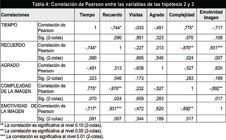Estos resultados indican lo siguiente: a) Existe una correlación negativa estadísticamente significativa (p<.024) entre la variable recuerdo y complejidad de la imagen; b) Una correlación positiva entre recuerdo y emotividad de la imagen (p<.007); c) Una correlación negativa entre emotividad y complejidad (p<.017).