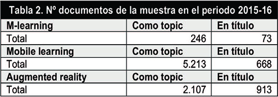 El total de documentos que incluyen términos relacionados con el aprendizaje móvil es de 26.670 registros, mientras que los que incluyen «augmented reality» es de 10.155. Estos registros llevan asociada una fecha de inscripción, y como este volumen de datos es muy elevado hemos considerado necesario que prevalezca el criterio de temporalidad y recoger la producción científica más reciente. La referencia ha sido la variable «registros realizados en el periodo desde el 2015-01-01 hasta 2016-11-16». Esto permite trabajar con cifras más ajustadas, así «augmented reality» aparece en 913 títulos, y 2.107 documentos lo contienen como descriptor. Y «m-learning» aparece en 73 títulos y en 246 de documentos, y «mobile learning» está en el título de 668 registros y como descriptor en 5.213 documentos.
