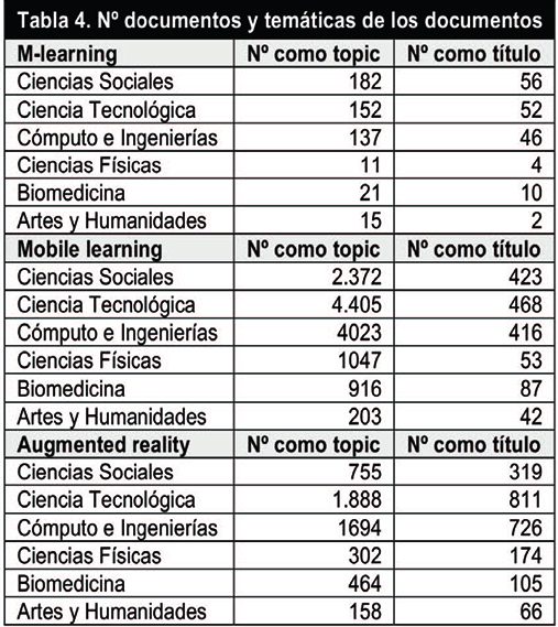 Se observa que en el periodo analizado de 2 años se ha recogido un 20% del total de registros sobre la literatura científica almacenada en los últimos 24 años. Esto sucede tanto para m-Learning como para RA, y la producción tiene un carácter más puntual al estar centrada en artículos y ponencias, siendo menos los libros (editorial). En la Tabla 4 se detallan las cantidades de documentos con los términos analizados distribuidos por las principales áreas temáticas. Los registros pueden estar asociados simultáneamente a varias áreas.