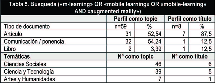 También se realizó una búsqueda con el perfil: Tema: («m-learning» OR «mobile learning» OR «mobile-learning») AND «augmented reality» (Tabla 5). Se detectó que no hay revisiones recientes sobre estos temas en conjunto. Se señalan las temáticas que se abordan en los artículos localizados con este perfil específico, destacando las Ciencias Sociales que incluyen Educación.