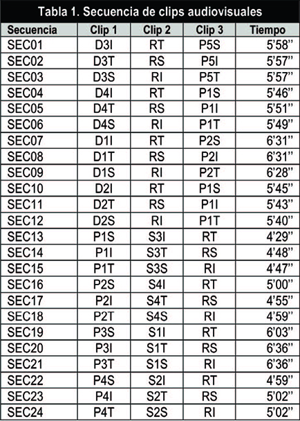 Cada uno de los clips se editó en tres versiones: sonido (S), imagen (I) o todo (T). Así, los niños de cada clase eran expuestos a una secuencia formada por tres clips, cada clip con una versión diferente (S, I o T). La secuencia podía ser, en función del género audiovisual, dibujos-reportaje-película (secuencias 01 a 12) o película-serie-reportaje (secuencias 13 a 24). En la Tabla 1 se muestra cada secuencia. El primer elemento de cada clip se refiere al género audiovisual, esto es, p=película, d=dibujos, s=serie, r=reportaje. El segundo elemento, en el caso de tres elementos, es el número relativo a la película, dibujos o serie en cuestión. Por último, el tercer elemento (o segundo cuando solo haya dos) es el relativo a la versión audiovisual, es decir, s=sonido, i=imagen, t=todo.