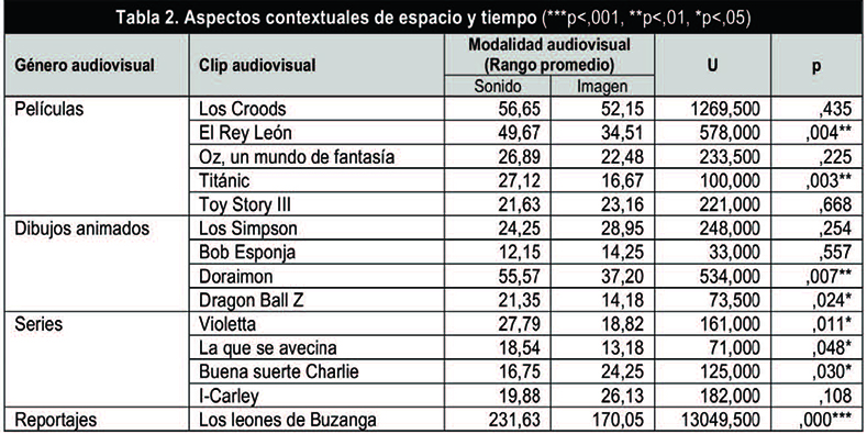 En ocho de los catorce clips se hallaron diferencias, los cuales pertenecían a los cuatro géneros audiovisuales utilizados. De ellos, en siete la apreciación de los aspectos contextuales de espacio y tiempo para la modalidad S fue superior a la de I, concretamente en «El Rey León», «Titanic», «Doraimon», «Dragon Ball Z», «Violetta», «La que se avecina» y «Los leones de Buzanga». Tan solo en la serie «Buena suerte Charlie» la modalidad I superó a S.