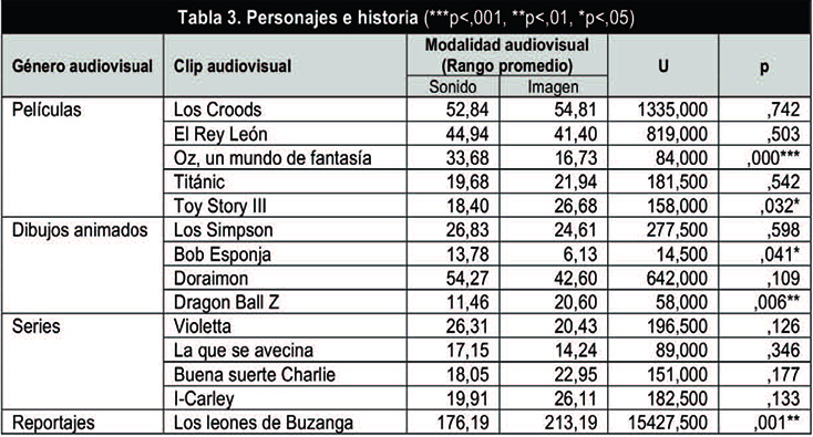 En lo relativo a la categoría de personajes e historia, la Tabla 3 recoge los resultados para las dos modalidades de presentación analizadas.