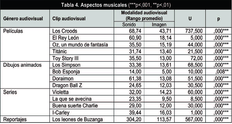 En la categoría de aspectos musicales, como era de esperar, se encuentran diferencias a favor del sonido en todos los clips audiovisuales empleados en géneros audiovisuales.