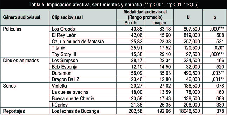 Continuando, en la categoría de implicación afectiva, sentimientos y empatía se hallan diferencias en los géneros de películas y dibujos animados. En las películas «Los Croods» y «Toy Story III» las puntuaciones son superiores para la modalidad imagen, mientras que en «Titanic» y «El Rey León» lo son para el sonido. Por su parte, en los dibujos animados «Doraimon» y «Dragon Ball Z» la valoración es superior en la modalidad de sonido.