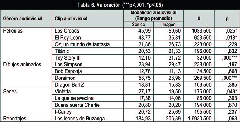 Para finalizar, en la Tabla 6 (página siguiente) se observan las respuestas en la categoría de valoración en cada clip audiovisual.