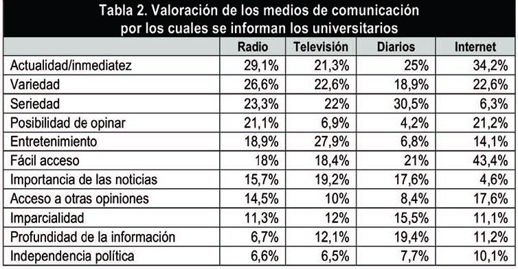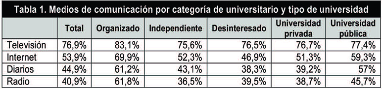 La televisión es el medio más utilizado, seguido de Internet, los diarios y la radio. Los jóvenes de universidades públicas leen más diarios y escuchan más la radio que los de las privadas (Tabla 1). Asimismo, los primeros manifiestan mayor interés y son más activos buscando información; consultan más fuentes.