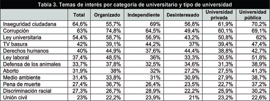 En mayor o menor medida estos son los asuntos que concitan la atención de los universitarios. Son los de universidades públicas y los organizados quienes manifiestan en un porcentaje mayor su interés por la inseguridad ciudadana, la ley universitaria, la televisión basura y la discriminación. La defensa del medio ambiente interesa más a los universitarios de las públicas y menos a los de privadas. La corrupción, la ley laboral, la ley universitaria, el aborto y la pena de muerte interesan más a los organizados y a los de universidades públicas.