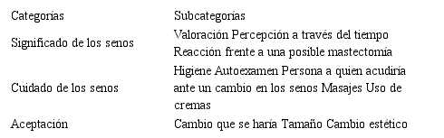 En las mujeres entrevistadas priman, sobre este órgano, los cuidados estéticos como aplicación de cremas, masajes y ejercicios sobre los cuidados de salud como la realización del autoexamen de mama (aunque todas manifestaron conocer sobre el autoexamen). De igual forma, se pudo establecer que el ideal estético guarda relación directa con el tamaño y consideran que un seno grande representa mayor atractivo para el sexo opuesto. El análisis y la interpretación de los datos obtenidos permitieron la identificación de tres categorías: significado, cuidados y aceptación de los senos (Tabla 1).