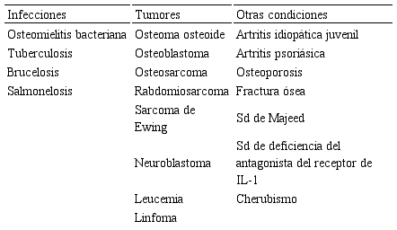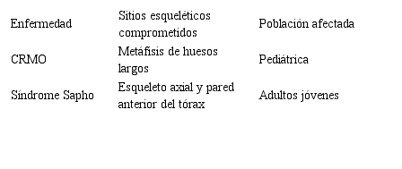 Diversas patologías deben ser incluidas en el diagnóstico diferencial de la CRMO (Tabla 1); sin embargo, la infección y los tumores óseos son los que representan mayor preocupación.