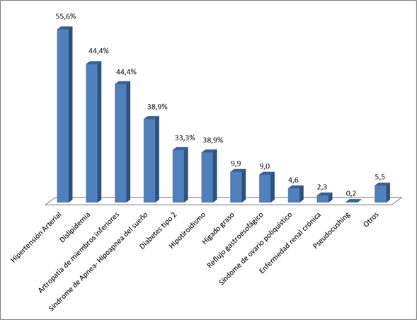 En los nueve pacientes mayores de 65 años (1.7%), las comorbilidades más frecuentes fueron dislipidemia y Sahos en el 44.4% y artropatía de miembros inferiores 32.3%. Sólo hubo un paciente menor de 18 años, cuyo índice de masa corporal fue de 41.5 kg/m2 y que tenía diagnósticos de hipertensión arterial, DM2, artropatía de miembros inferiores y Sahos.