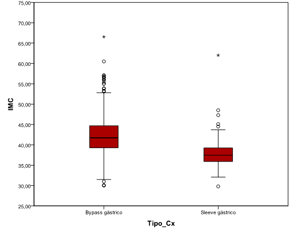 Se comparó el índice de masa corporal de los pacientes intervenidos a través de bypass gástrico frente a los intervenidos con sleeve gástrico y se encontró que los sometidos a bypass tenían un índice de masa corporal mayor que los pacientes de sleeve; los primeros tuvieron una mediana de 41.7 RIC (39.3–44.7), mientras que los sometidos a sleeve tuvieron una mediana para el índice de masa corporal de 37.4 (RIC 35.9 – 39.3; p <0.0001; Figura 2).