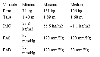 El paciente con menor índice de masa corporal tenía 29.8 kg/m2 y el de mayor 66.5 kg/m2; la mediana de la presión arterial sistólica y de la presión arterial diastólica presentó valores inferiores a los estipulados para el diagnóstico de hipertensión arterial. Se aclara que todos los pacientes hipertensos del programa estaban en tratamiento antihipertensivo. En la Tabla 1 se presentan las medidas de resumen para estas variables.