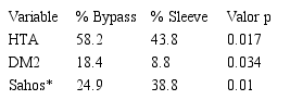 Entre los 89 pacientes con diabetes mellitus tipo II (DM2), el 92.1% fue sometido a bypass gástrico y los restantes a sleeve (p =0.034). Por otro lado, entre los 235 con dislipidemia, al 86.8% se le realizó bypass gástrico y el resto fue sometido a sleeve (p =0.240).