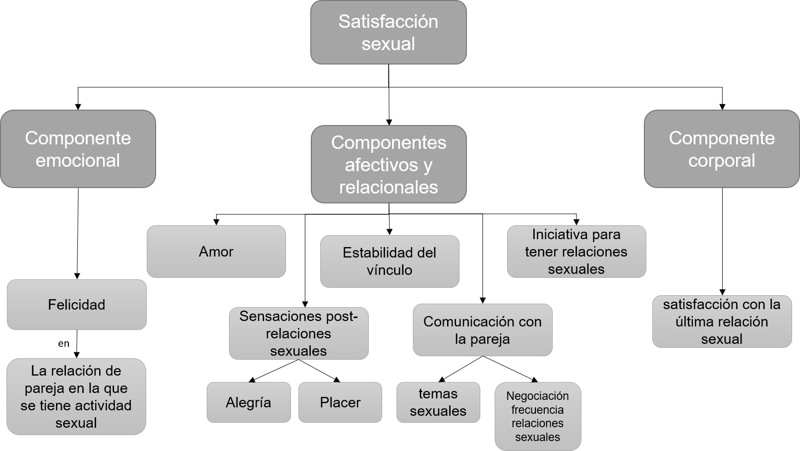 Para el presente estudio la satisfacción sexual se definió a partir de dos elementos fundamentales en la satisfacción sexual: uno corporal y otro afectivo/emocional. La satisfacción sexual corporal indica la satisfacción con la última relación sexual, mientras que la satisfacción sexual emocional sugiere la felicidad con la pareja que se tiene actividad sexual7.