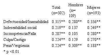 Se analizó la correlación entre el índice de satisfacción sexual y los esquemas mal adaptativos tempranos del área de la autovaloración divididos en dos grupos según el género. Se encontraron diferencias entre ambos grupos: en los hombres se evidencia asociación entre el índice de satisfacción sexual y el esquema de pena/vergüenza y en las mujeres mayor correlación y significancia estadística con el esquema de defectuosidad/inamabilidad (ver Tabla 2).