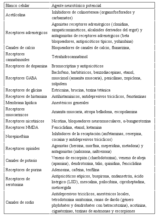 Existen diferentes mecanismos de acción de los xenobióticos para causar alteraciones en el estado de conciencia, dentro de los que se destacan: interacción directamente con el receptor, alteración en la conducción de membrana, lesión mitocondrial, alteración de la síntesis, liberación, recaptación y degradación de neurotransmisores15. En la Tabla 1 se describen los blancos celulares y los agentes neurotóxicos.