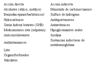 Hay dos mecanismos por los que algunas sustancias producen coma: daño directo en las células cerebrales o daño indirecto por efecto en otros sistemas. En la Tabla 2 se presentan varias sustancias que, por su acción directa o indirecta, se asocian con la depresión del estado de conciencia y al coma.