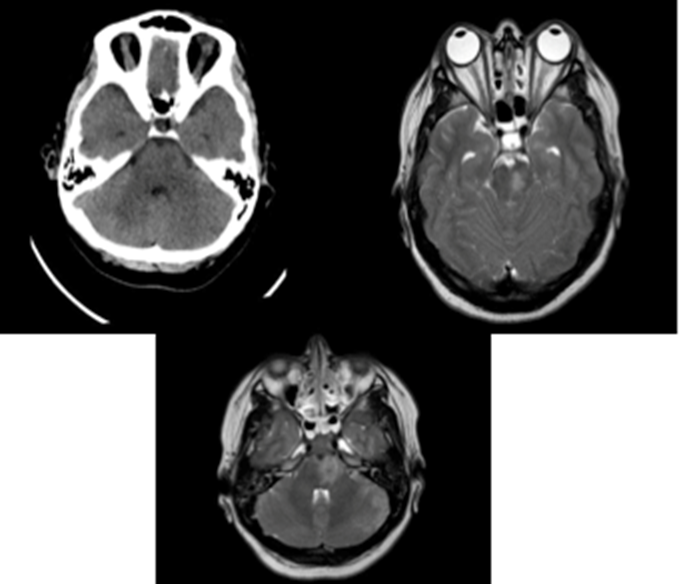 Cuando se evaluó de nuevo a la paciente a pesar de tener en ese momento hallazgos de un toxidrome sedante, este se explicaba por administración previa de midazolam, se conceptuó que aunque había antecedentes que obligaban a pensar en una causa tóxica y este cuadro podía corresponder a sustancias depresoras como el amitraz por la presencia inicial de ataxia, nistagmus vertical, disartria más el relato de varias fuentes de información confiable que negaban ingesta de ningún tóxico o medicamento, se decidió descartar organicidad. Se inicia desmonte de benzodiacepinas para poder evidenciar compromiso neurológico, se solicita resonancia magnética nuclear (RMN) en la cual se evidenciaron hallazgos congruentes con enfermedad cerebrovascular de fosa posterior. En la RMN se visualiza compromiso isquémico que compromete la protuberancia en el lado izquierdo y el hemisferio cerebeloso izquierdo, observándose hiperintensidad en las imágenes con hipointensidad en el mapa de coeficiente de difusión, sin definir transformación hemorrágica En las secuencias de angioresonancia se definen las estructuras vasculares permeables. Se descartó síndrome antifosfolipido; la paciente requirió traqueostomia y salió con secuelas del ecv, respuesta plantar extensora izquierdo y hemiplejia derecha. Ver Figura 1.
