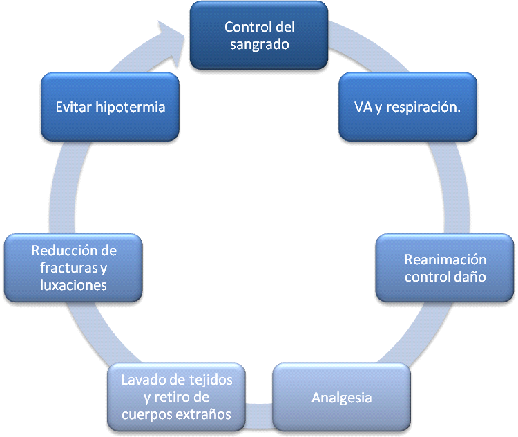 La identificación del trauma vascular de extremidades y su manejo inicial está a cargo del personal que tiene contacto con el paciente lesionado, tanto en el ambiente prehospitalario como hospitalario, sin olvidar que el control de la hemorragia, en caso de ser esta evidente, debe ser el primer paso a tener en cuenta, sobre todo en casos en los que no se ha instaurado el choque, dado que esto impacta marcadamente en la morbimortalidad.