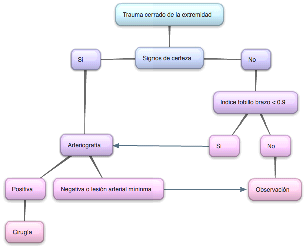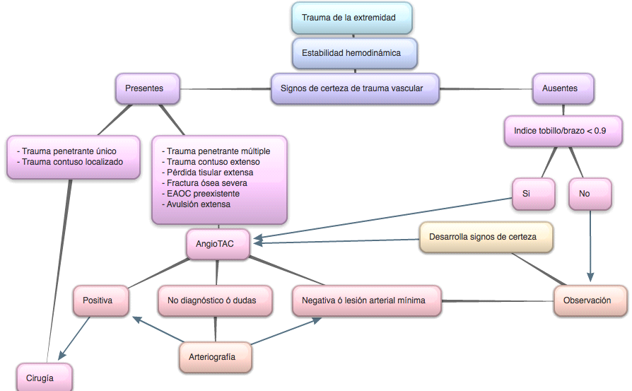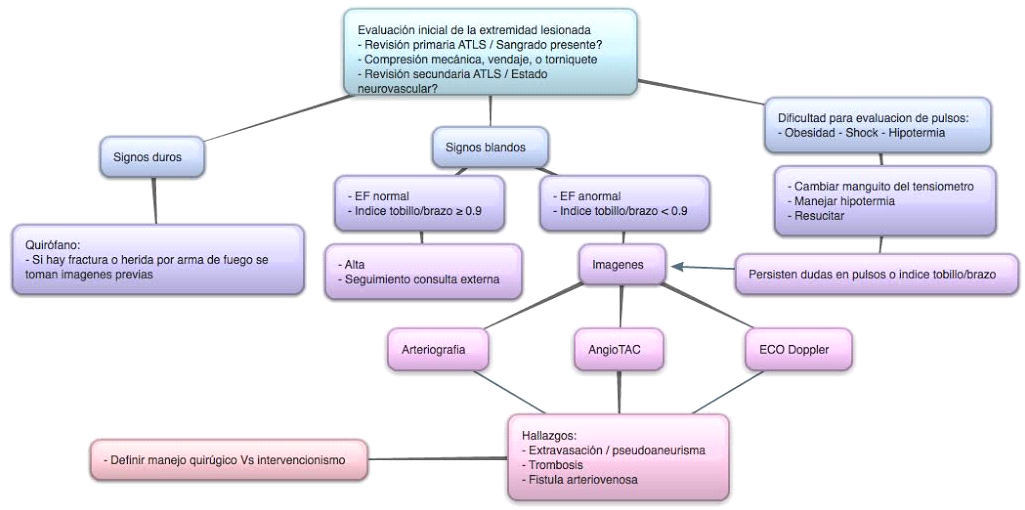 Existen varios algoritmos para el abordaje del paciente con trauma vascular en las extremidades. A continuación, se mostrarán los utilizados por dos escuelas: Western Trauma Association (WTA) de Estados Unidos (Figura 2) y el utilizado en el Hospital San Vicente Fundación de Medellín (Figura 3 y Figura 4).