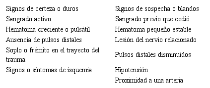 Los signos clínicos con mejor seguridad diagnóstica para definir trauma vascular en las extremidades son conocidos como signos duros o de certeza, estos son: sangrado activo, hematoma creciente o pulsátil, ausencia de pulsos distales, soplos o frémitos sobre el área del trauma y signos o síntomas de isquemia regional (parestesias, dolor, palidez, paresia o parálisis, hipoestesia o anestesia, dolor, llenado capilar lento y frialdad), los cuales deben ser evaluados en los pacientes que se encuentren hemodinámicamente estables para que sean confiables (ver Tabla 1)11,17,31,32,33,34.