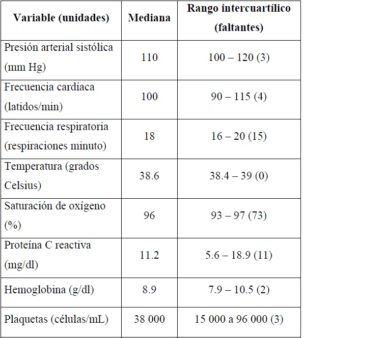 El estado clínico inicial de los participantes era aceptable, se presentan con estabilidad hemodinámica, con una mediana de presión arterial sistólica de 110 mmHg, pero taquicárdicos (frecuencia cardiaca promedio de 100 latidos por minuto) y febriles, con un promedio de temperatura de 38.7 °C.