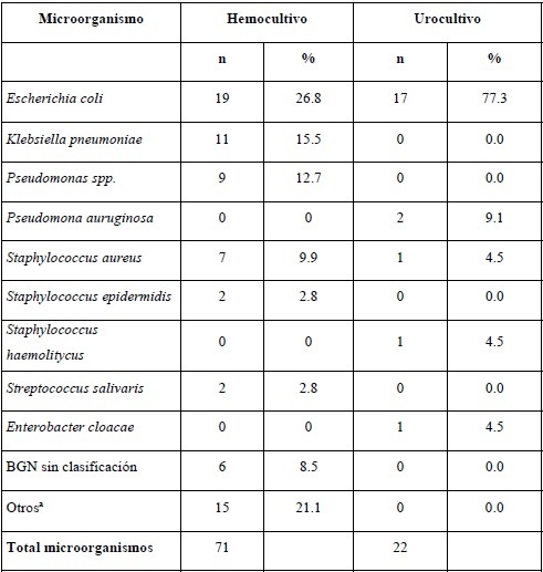 Madrid C. (2013) reporta en Colombia los microrganismos Gram negativos como los más comunes y señala a E. coli como el patógeno más frecuente, seguido por K. pneumoniae y S. aureus14. En las referencias mundiales se evidencia el mismo comportamiento con una mayor prevalencia de infecciones por Gram negativos12,15,16, pero llama la atención el aumento en las infecciones por Gram positivos que, en algunos estudios, ocupan el primer lugar, asociadas con factores de riesgo específicos como mucositis grave, uso de catéteres vasculares por largo tiempo y uso de antibióticos profilácticos contra Gram negativos15,16,17. Estos factores, aparentemente, no están presentes con igual frecuencia en la población descrita y esto podría explicar la proporción de Gram positivos inferior al 20% del total de bacteriemias.