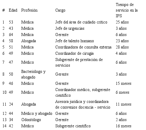 Los participantes fueron cinco gerentes y nueve profesionales con cargos administrativos de IPS públicas de segundo y tercer nivel de complejidad, que no fueran categorizadas como hospitales universitarios. Los nueve directivos tenían a cargo procesos asistenciales o misionales. Se excluyeron los gerentes y directivos que se negaran a participar de manera voluntaria, a ser grabados en la entrevista o a firmar el consentimiento informado. En la Tabla 1 se presenta la caracterización de los participantes.