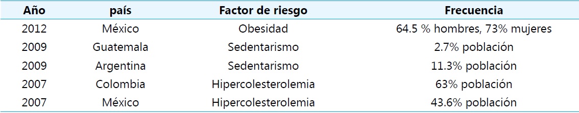 Tabla 1. Factores de riesgo de mayor relevancia en la aparición de enfermedad cardíaca isquémica, en algunos países de Latinoamérica durante el periodo de 2007 a 2012.