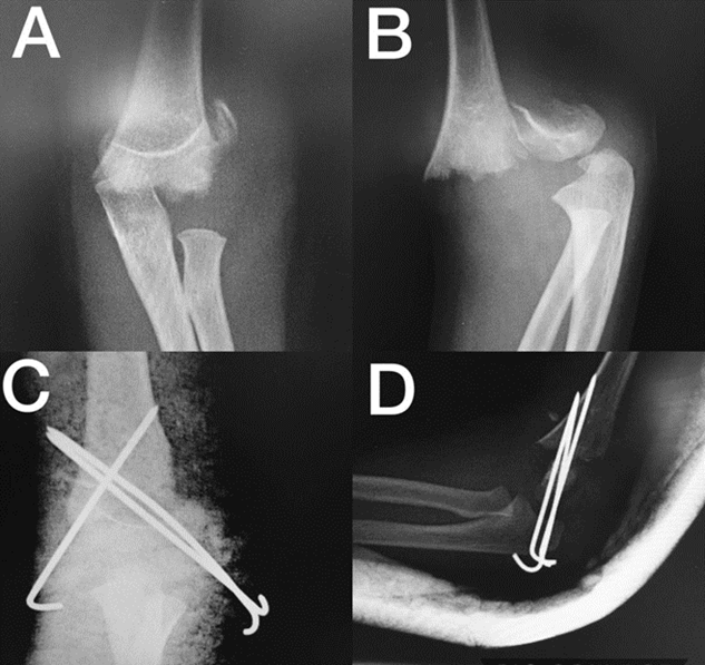 Siguiendo con la técnica quirúrgica, mientras se mantiene el brazo flexionado para conservar la reducción, el primer pin se inserta lateralmente de distal a proximal, lo más cerca posible a la línea media de la diáfisis del húmero, lateral al olécranon hasta llegar a la cortical medial del húmero, atravesando la línea de fractura. El segundo pin se inserta justo en el cóndilo lateral con el objetivo de que quede divergente al primero y atraviese la línea de fractura tan alejado del primer pin como sea posible, para que la reducción quede estable. Igualmente se avanza hasta que atraviese la cortical medial del húmero21.