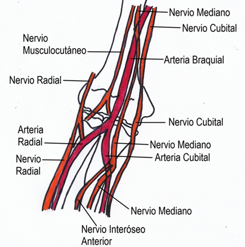 La arteria braquial desciende desde el brazo pasando justo en la línea media de la articulación del codo a nivel de los epicóndilos, para luego dividirse en la arteria radial y la cubital (ulnar). La arteria braquial profunda y ambas ulnares colaterales, ramas que da la braquial antes de pasar por la articulación del codo, podrían llevarle flujo al antebrazo en una eventual lesión de dicha arteria a ese nivel (Figura 1). Por esta razón, es raro que haya compromiso en la irrigación distal, gracias a la circulación colateral del miembro superior. Además el músculo braquial suele proteger la arteria braquial. Sin embargo, un desplazamiento grave puede lesionar el músculo y por ende la arteria4,5.