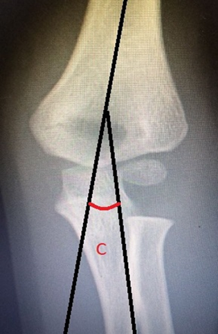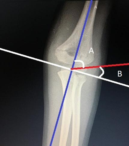Otro ángulo importante es el de carga del codo, que puede ser evaluado en radiografía AP, o clínicamente. Está formado por la intersección de la línea del eje medio del brazo con la línea del eje medio del antebrazo (Figura 7). Sirve para medir el alineamiento coronal del brazo con el antebrazo y determina la desviación en varo o en valgo de la extremidad. Su valor varía entre 5% y 15° en el 95% de la población, con un promedio de 10°24,25.