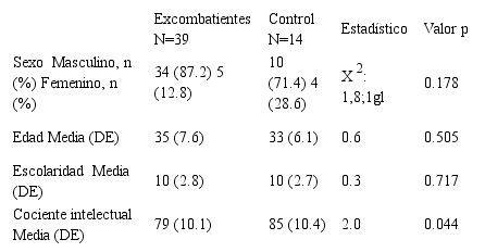 La muestra de este estudio fue seleccionada por conveniencia. Estuvo compuesta por 39 excombatientes activos en el programa de la Alta Consejería de la Presidencia para la Reintegración (ACR) residentes en Antioquia, que cumplieran los criterios de inclusión y 14 controles homogéneos de ambos sexos; 10 (71.4%) hombres y 4 (28.6%) mujeres, con una edad promedio de 32 años y una escolaridad promedio de 10 años. La capacidad intelectual (CI) estimada de los controles fue significativamente superior a la de los combatientes. No hubo otras diferencias significativas en las características demográficas de los grupos (Tabla 1).