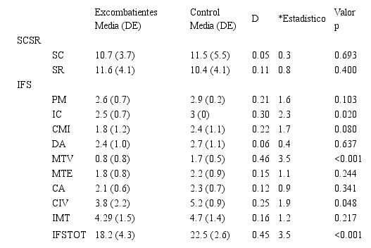 En la Tabla 2 están las puntuaciones en el cuestionario de medición del SAC/SIC (SR-SC), y en la IFS para rastreo de FE, del grupo de excombatientes y del grupo control. No hubo diferencias significativas entre los grupos en las escalas del cuestionario SR-SC. Se observó una puntuación total en el IFS significativamente inferior en el grupo de excombatientes. Esta puntuación inferior se explica por puntuaciones menores en las subpruebas de MTV, IC y CIV (p <0.05).